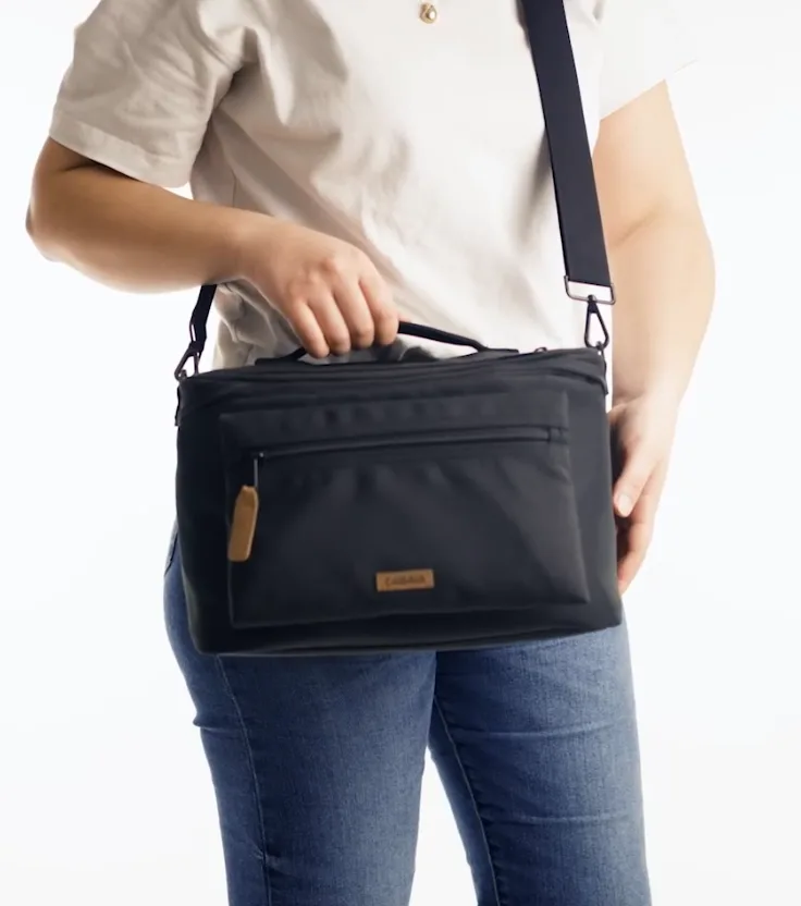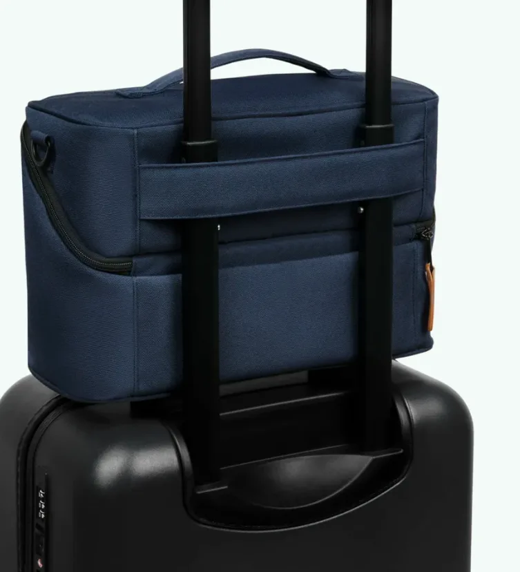 * Bandoulière, poignée rembourrée, passant attache valise.